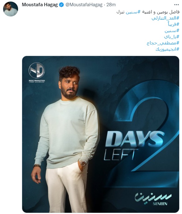 نشر مصطفى حجاج على حسابه الشخصي تويتر صورة له من الأغنية وكتب: فاضل يومين وأغنية سنين تنزل العد التنازلي قريبًا.