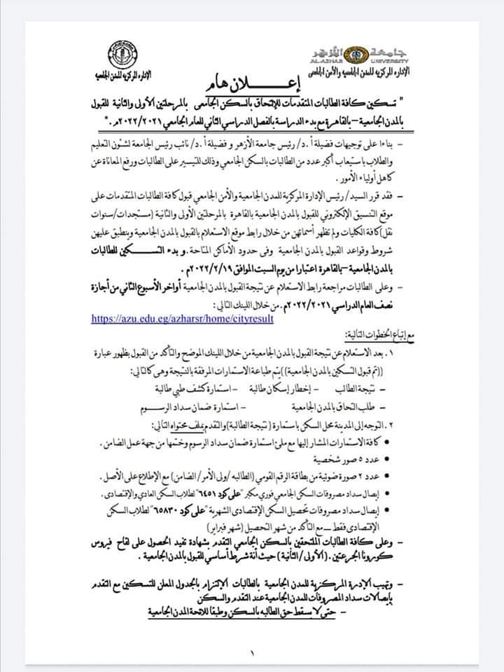 وجاء في القرار: بناءً على توجيهات الدكتور محمد المحرصاوي رئيس جامعة الأزهر ونائب رئيس الجامعة لشئون التعليم والطلاب بالتيسير على الطلاب والطالبات واستعدادا بدء الدراسة بالفصل الدراسي الثاني 2021_2022م، ف قد قرر رئيس الإدارة المركزية للمدن الجامعية والأمن الجامعي فتح أبواب المدن الجامعية للطلاب والطالبات بالقاهرة، اعتبارا من يوم الخميس الموافق 17 / 2 / 2022.