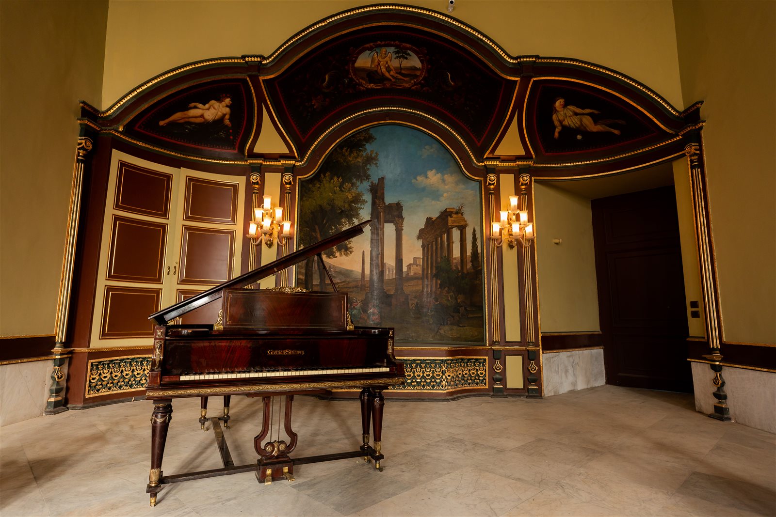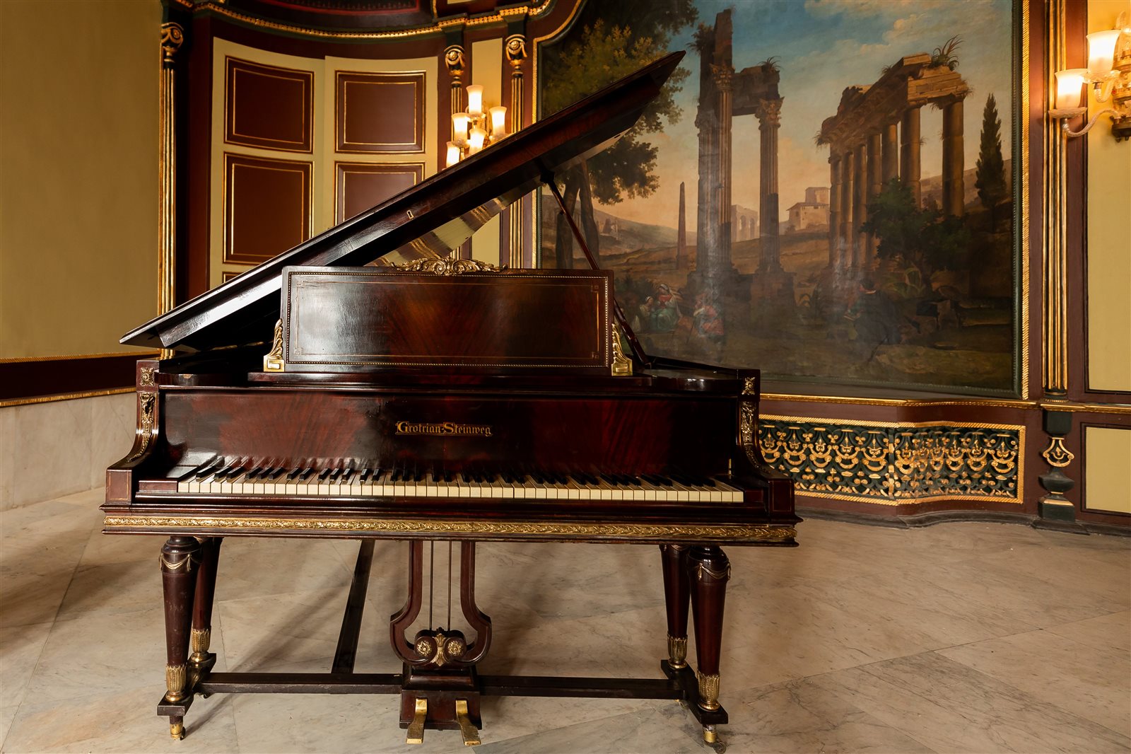 وأضافت الوزارة، أن البيانو من إنتاج Grotrian-Steinweg (جروتريان شتاينفيج) الألمانية، وهو مصنوع من الخشب الأبانوس المطعم بالبرونز، يرتكز على أرجل متصلة فيما بينها، وجوانبه وأرجله مزخرفة بحليات معدنية، وفي مقدمته يوجد الوحدة الخاصة بالعزف يعلوها غطاء للفتح والغلق.