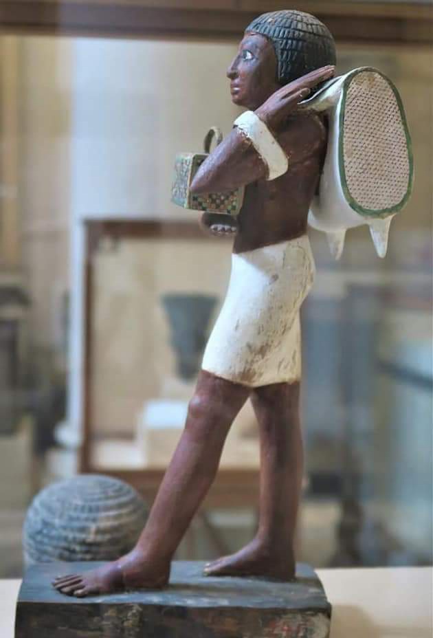 التمثال خشبي، تحفة فنية ﻻ يزيد طوله عن 15 سم، يصور أحد الخدم واقفًا حاملًا سلة على يده اليمنى المضمومة إلى صدره، السلة مزينة بمربعات ملونة، بينما يحمل على ظهره سلة شنطة لها شريطين أبيضين يستخدمان لحملها على الكتف ومربوطة بيده اليسرى، ومزودة بحامل لها، لتستقر به، التمثال محفوظ بالمتحف المصري بالتحرير.