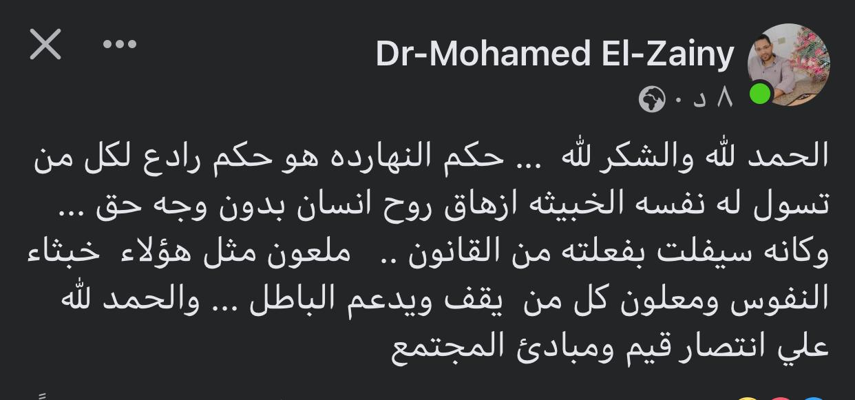 وكتب في رسالته: الحمد لله والشكر لله، حكم النهاردة هو حكم رادع لكل من تسول له نفسه الخبيثة إزهاق روح إنسان دون وجه حق وكأنه سيفلت بفعلته من القانون، ملعون مثل هؤلاء خبثاء النفوس ومعلون كل من يقف ويدعم الباطل،والحمد لله علي انتصار قيم ومبادئ المجتمع.