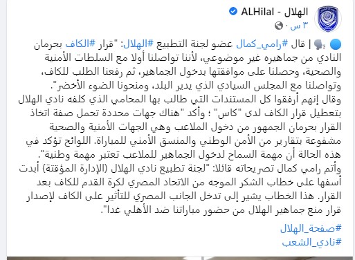 وأضاف وفقا للصفحة الروسية للنادي على موقع فيس بوك، أن قرار الكاف بمنع دخول الجماهير خلال اللقاء المرتقب بين النادي الأهلي ونادي الهلال السوداني غدًا الجمعة، قرار غير موضوعي، مشيرًا إلى أن النادي تواصل أولا مع السلطات الأمنية والصحية، وحصلنا على موافقة بدخول الجماهير، ثم رفع الطلب للكاف، وأنهم أرفقوا كل المستندات التي طالب بها المحامي الذي كلفه نادي الهلال بتعطيل قرار الكاف، مؤكدًا أن جهات محددة تحمل صفة اتخاذ القرار بحرمان الجمهور من دخول الملاعب وهي الجهات الأمنية والصحية من خلال تقارير من الأمن الوطني والمنسق الأمني للمباراة.