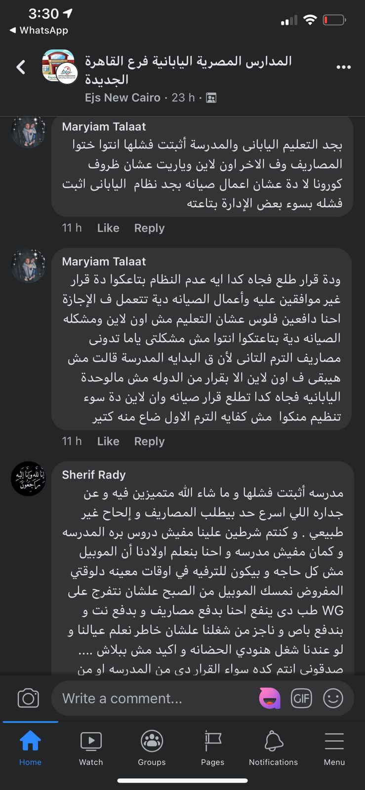 وهو ما علقت عليه مريم طلعت، إحدى أولياء الأمور بمدرسة المصرية اليابانية بفرع القاهرة الجديدة، قائلة: "وده قرار طلع فجأة كدا؟ إيه عدم النظام بتاعكوا ده قرار غير موافقين عليه، وأعمال الصيانة دية تتعمل في الإجازة إحنا دافعين فلوس عشان التعليم مش أون لاين ومشكلى الصيانة دية بتاعتكوا انتوا مش مشكلتي، وأما تدوني مصاريف الترم التاني لأن من البداية المدرسة قالت مش هيبقى فيه أون لاين إلا بقرار من الدولة مش من الوحدة اليابانية فجأة كدا تطلع قرار صيانة وأون لاين ده سوء تنظيم منكم مش كفاية الترم الأول ضاع منه كتير.