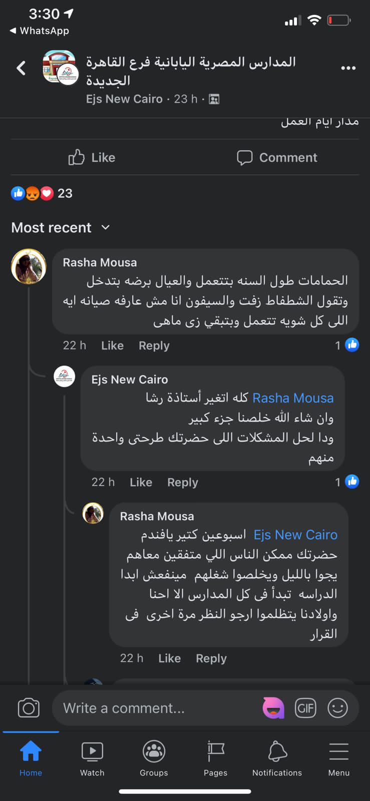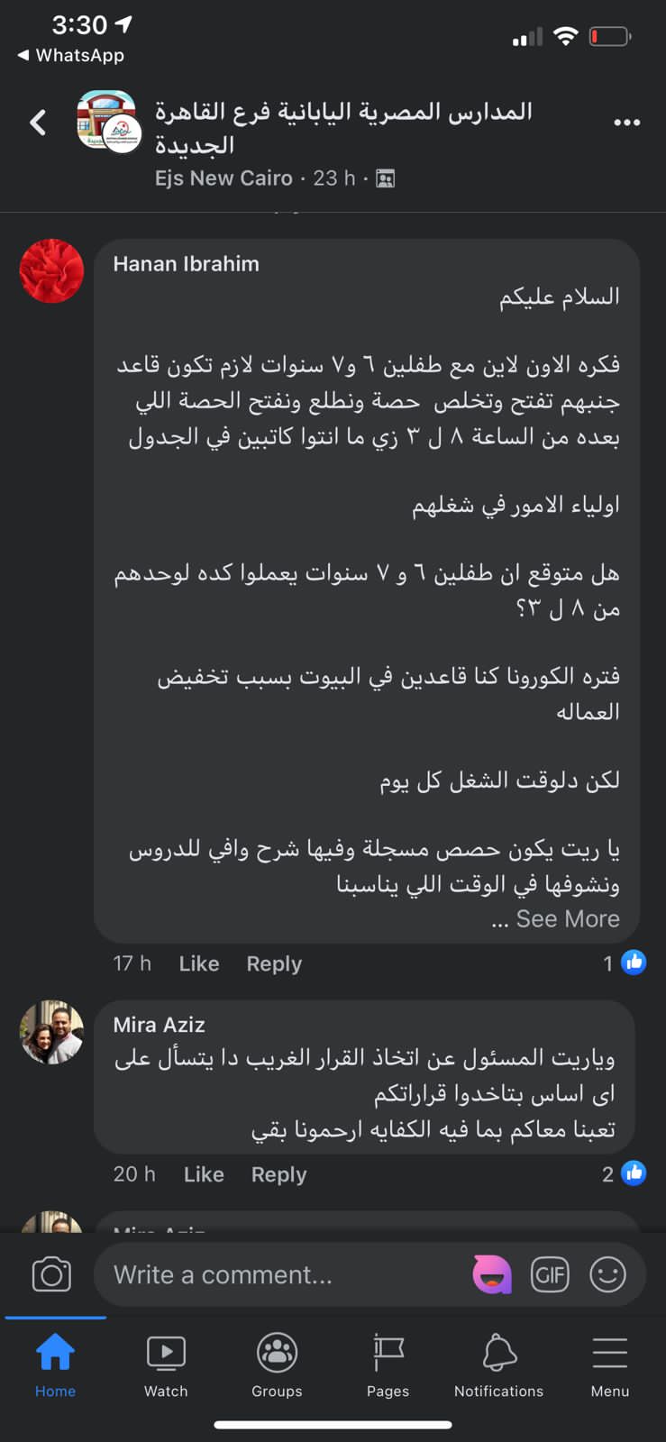 بينما قال شريف راضي، ولي أمر: مدرسة أثبتت فشلها وما شاء الله متميزين فيه وعن جداره اللي أسرع حد بيطلب المصاريف وإلحاح غير طبيعي، وكنتم شارطين من البداية علينا مفيش دروس برة المدرسة وكمان مفيش مدرسة وإحنا بنعلم أولادنا أن الموبايل مش كل حاجة وبيكون للترفيه في أوقات معينة، دلوقتي المفروض نمسك الموبايل من الصبح علشان نتفرج على WG، طب دا ينفع؟ إحنا بندفع مصاريف وبندفع نت وبندفع باص من شغلنا علشان خاطر نعلم عيالنا، ولو عندنا شغل هنودي الحضانة وأكيد مش ببلاش. مضيفا: صدقوني أنتم كده سواء القرار دا من المدرسة أو من الوحدة أو من أي شخص أو الشركة فدا قرار غلط 100% لازم تراجعوا نفسكم كويس.