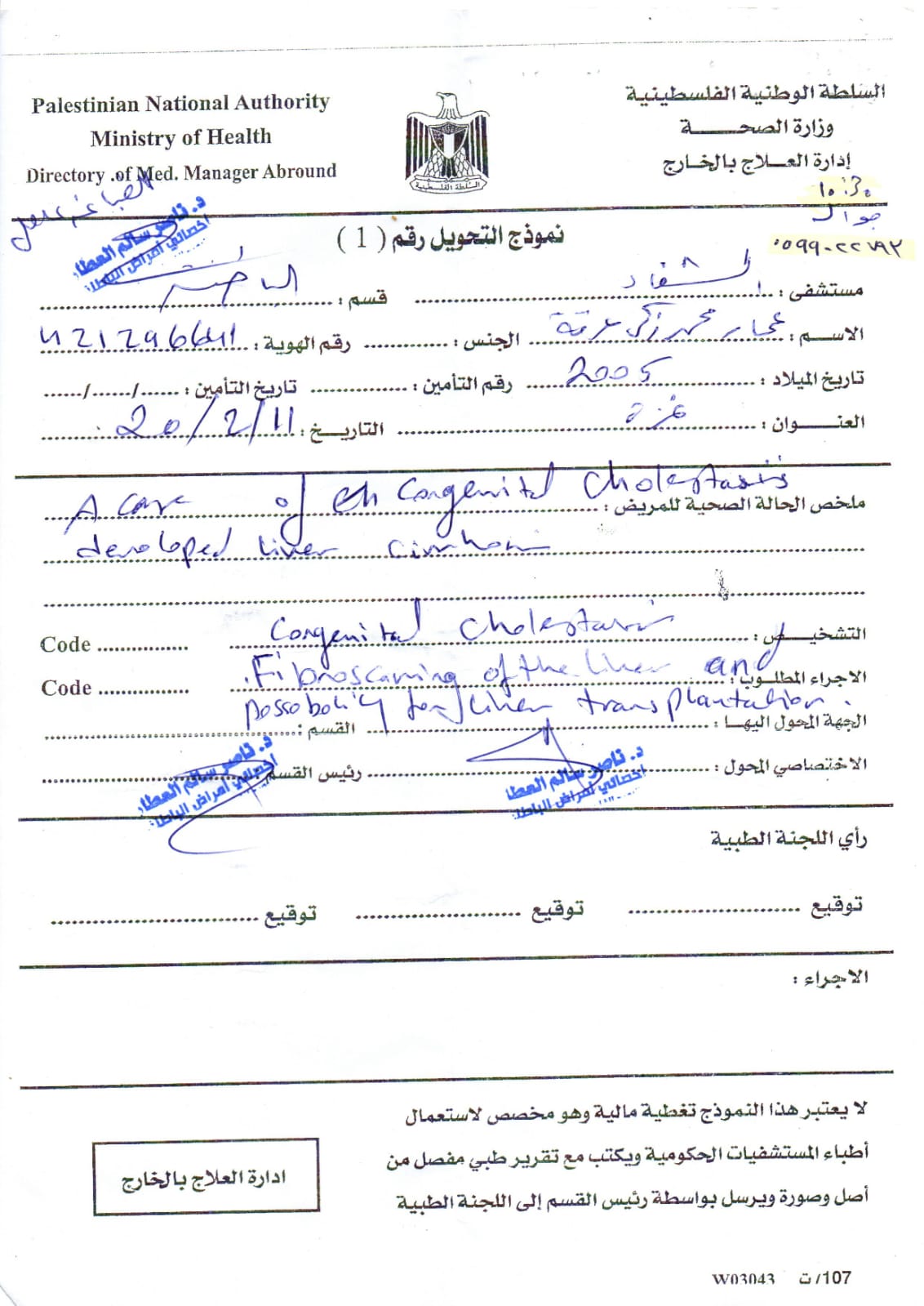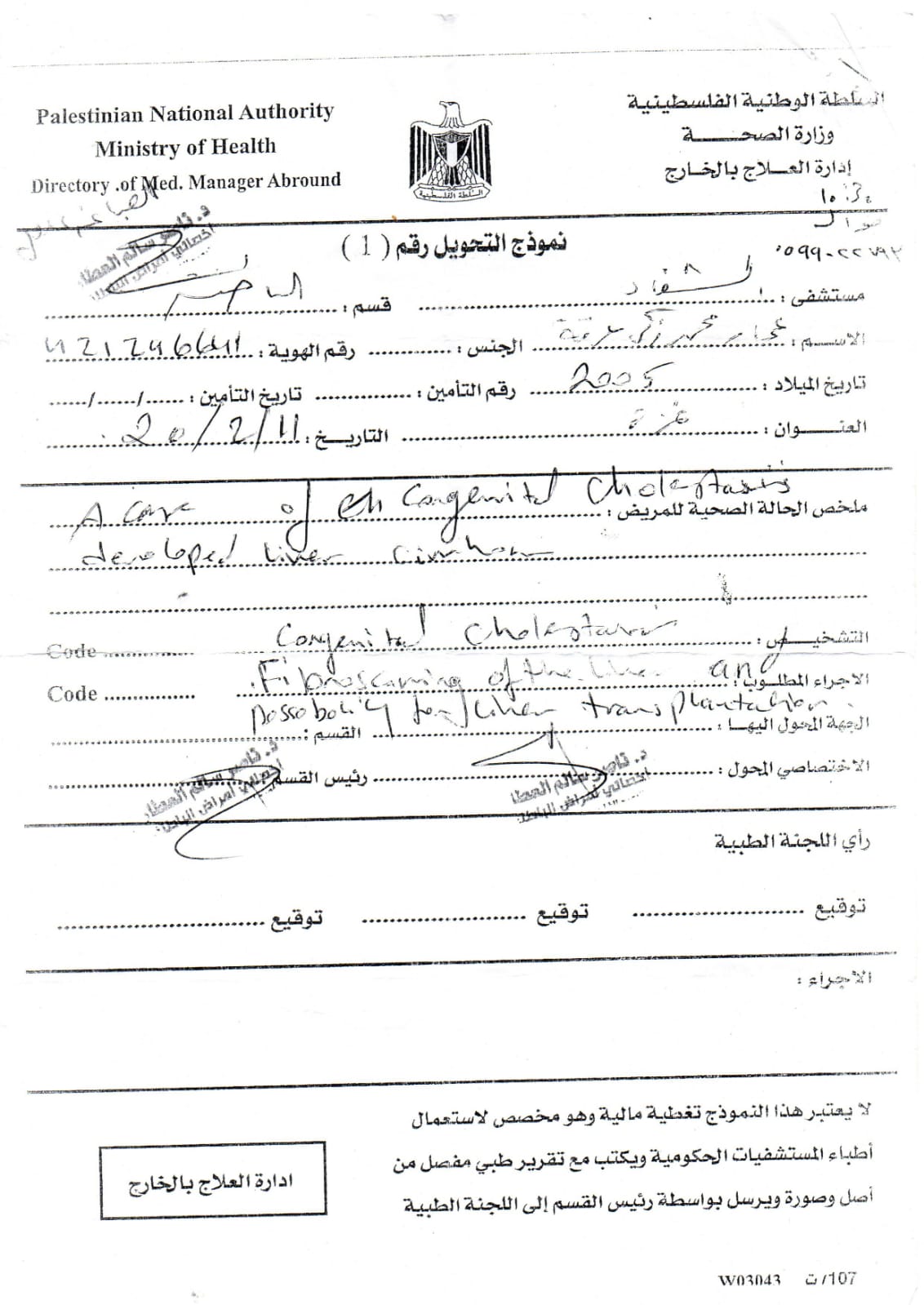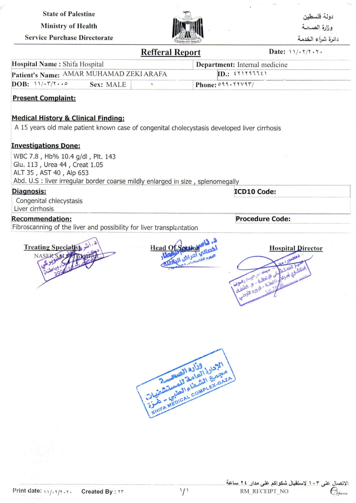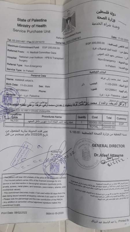 وتابع: حصلنا على تحويل إلى مستشفى معهد الكبد القومي التقدمي بمصر الشقيقة بالمنوفية، والآن نقوم بإجراءات السفر لبلدنا الأخرى مصر، ولكننا ننتظر رد السفارة الفلسطينية لمصر، لتوفير إسعاف من العريش حتى القاهرة، وصولا للمنوفية.