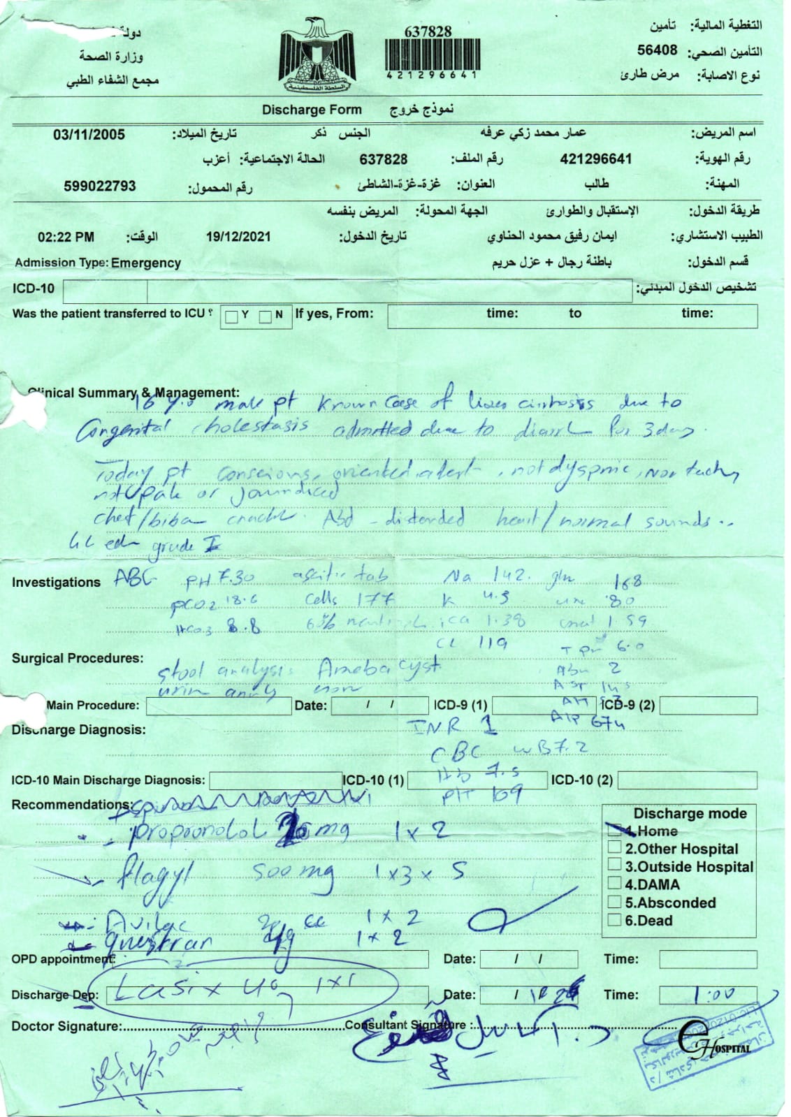 وأضاف عدنان المقيم بمخيم اللاجئين، الشاطئ، بمدينة غزة في فلسطين: عمار يعاني من مرض مزمن يتمثل في تليف كامل للكبد، إذ توقف عن العمل بشكل تام، وهو مرض مصاحب له منذ ولادته، والآن دخل مرحلة الخطر، والتي تنذر بفقدانه لا قدر الله.