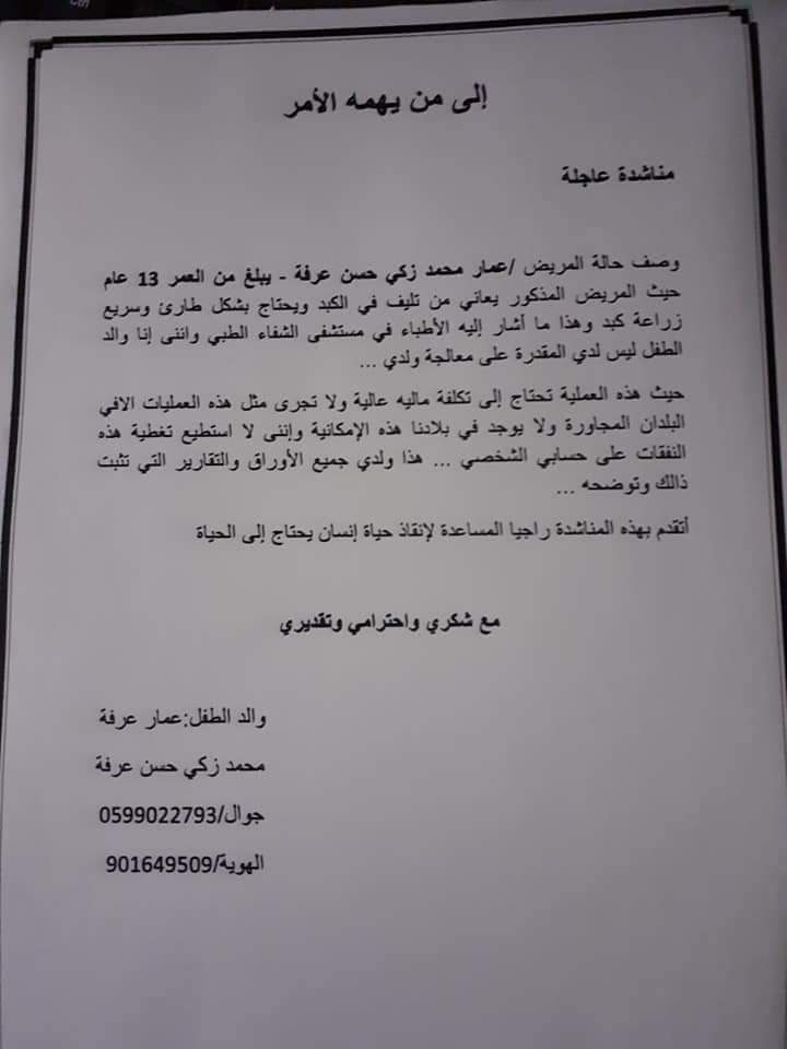 استغاث الشاب الفلسطيني عدنان محمد زكي عرفة، بالرئيس عبد الفتاح السيسي، لعلاج شقيقه الطفل عمار الفلسطيني، صاحب الـ 16 عامًا داخل مصر، والذي يعاني من تليف كامل للكبد.