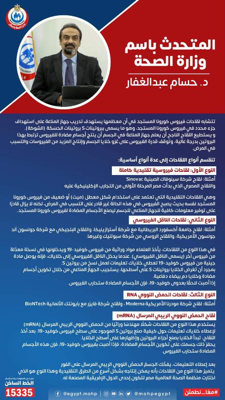 وأضاف عبدالغفار، في تصريحات له على صفحة وزارة الصحة الرسمية على موقع التواصل الاجتماعي فيس بوك، أن أنواع اللقاحات تنقسم إلى عدة أنواع أساسية، حيث لقاحات فيروسية تقليدية كاملة، لقاحات الناقل الفيروسي ولقاحات الحمض النووي RNA، موضحًا أن النوع الأول من لقاحات فيروسية تقليدية كاملة، أمثلة: لقاح شركة سينوفاك الصينية، واللقاح المصري الذي بدأت مصر المرحلة الأولى من التجارب الإكلينيكية عليه، لافتًا إلى أن ذلك النوع من اللقاحات التقليدية التي تعتمد على استخدام شكل معطل ميت، أو ضعيف من فيروس كورونا المستجد نفسه، بحيث يصبح الفيروس في هذه الحالة غير قادر على التسبب في المرض، لكنه لا يزال قادرًا على توفير معلومات كافية للجهاز المناعي للجسم ليصنع الأجسام المضادة لفيروس كورونا المستجد.