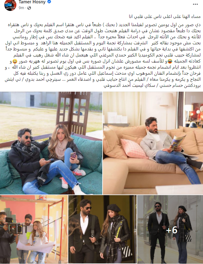 واختتم تامر حسني: للأسف لسه مصورش علشان أنزل صوره، بس في أول يوم تصوير له ههريه صور، وانتظروا بعد أيام انضمام نجمة جميلة مميزة، من نجوم المستقبل اللي هيكون ليها مستقبل كبير إن شاء الله، وفرحان جدًا بانضمام الفنان الموهوب أوي مدحت إسماعيل اللي عامل دور زي العسل، وربنا يكتب له فيه كل النجاح، ويكرمه ويكرمنا معاه، والفيلم من إنتاج حبايب قلبي وأصدقاء العمر سينرچي أحمد بدوي تي إيتش برودكشن حسام حسني، سكاي ليميت أحمد الدسوقي.