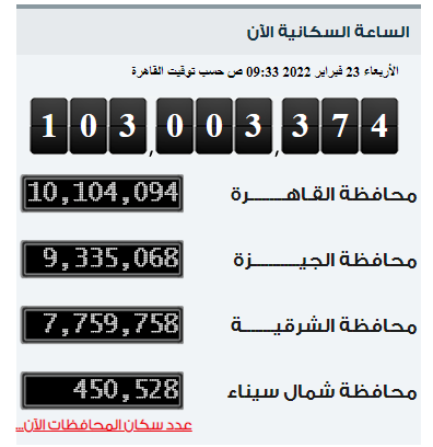 وأعلنت الساعة السكانية التابعة للجهاز المركزى للتعبئة العامة والإحصاء، المرتبطة بقاعدة بيانات تسجيل المواليد والوفيات بوزارة الصحة، تسجيل عدد سكان مصر في الداخل، نحو 103 ملايين 3374 نسمة، اليوم الأربعاء 23-2-2022.