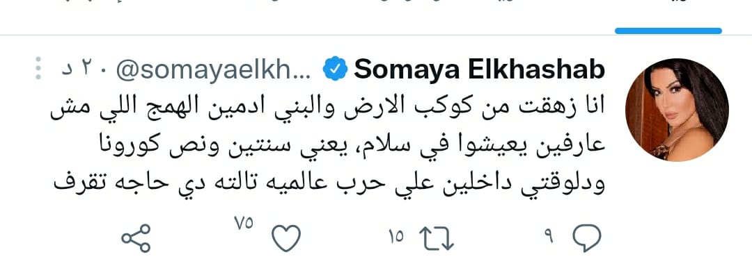 وكتبت سمية الخشاب تغريدة، عبر حسابه الشخصي بموقع التدوينات القصيرة تويتر، قالت فيها: أنا زهقت من كوكب الأرض، والبني آدمين الهمج، اللي مش عارفين يعيشوا في سلام، يعني سنتيت ونص كورونا، ودلوقتي داخلين على حرب عالمية ثالثة.. دي حاجة تقرف.