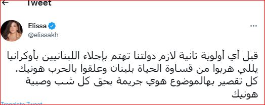 وكتبت إليسا عبر حسابها الشخصي بموقع التغريدات القصيرة تويتر: قبل أي أولوية تانية لأزم دولتنا تهتم بإجلاء اللبنانيين بأوكرانيا يللي هربوا من قساوة الحياة بلبنان، وعلقوا بالحرب هونيك.
