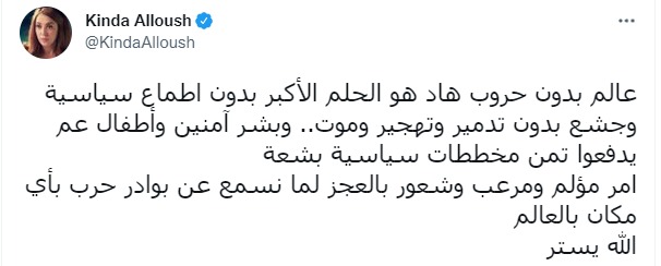 وعلقت أيضًا كندة علوش، عبر حسابها بـ تويتر: عالم دون حروب هاد هو الحلم الأكبر، دون اطماع سياسية وجشع دون تدمير وتهجير ومموت، وبشر آمنين وأطفال عم يدافعون تمن مخططات سياسية بشعة أمر مؤلم ومرعب وشعور بالعجز، لما نسمع عن بوادر حرب بأي مكان بالعالم.. الله يستر.