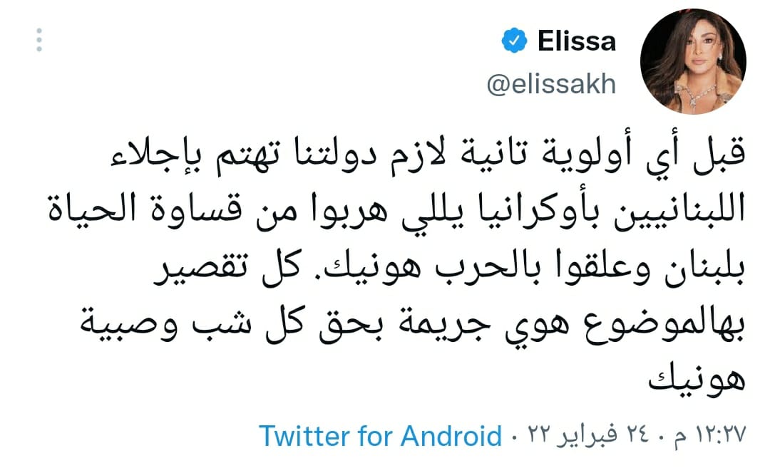 فيما علقت إليسا، عبر تويتر، قائلة: قبل أي أولوية تانية، لازم دولتنا تهتم بإجلاء اللبنانيين، بأوكرانيا يللي هربوا من قساوة الحياة، بلبنان وعلقوا بالحرب هناك، كل تقصير بهذا الموضوع هو جريمة، بحق كل شاب وصبية هونيك.