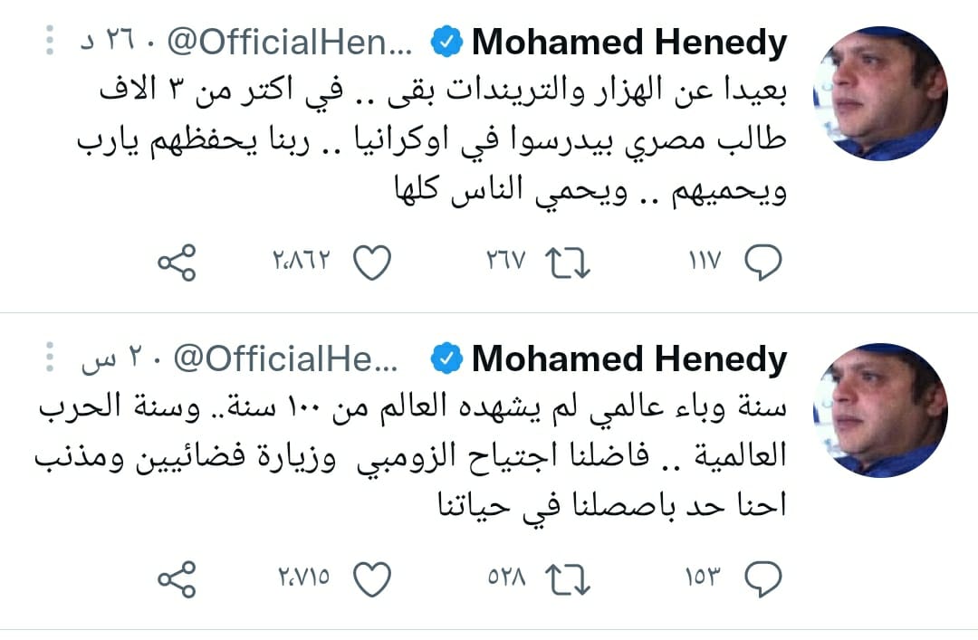 وكتب تغريدة أخرى، قال فيها: بعيدًا عن الهزار والتريندات بقى، في أكثر من 3 آلاف طالب مصري، بيدرسوا في أوكرانيا، ربنا يحفظهم يا رب ويحميهم، ويحمي الناس كلها.