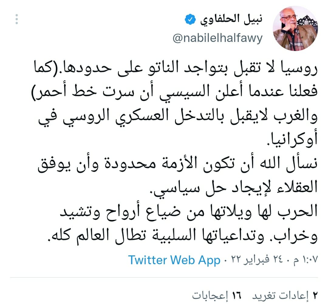 وعلق الحلفاوي على أزمة روسيا وأوكرانيا، عبر حسابه الشخصي بـ تويتر: روسيا لا تقبل بتواجد الناتو على حدودها، كما فعلنا عندما أعلن السيسي أن سرت خط أحمر، والغرب لا يقبل بالتدخل العسكري الروسي في أوكرانيا، نسأل الله أن تكون الأزمة محدودة، وأن يوفق العقلاء لإيجاد حل سياسي، الحرب لها ويلاتها من ضياع أرواح وتشيد وخراب، وتداعياتها السلبية تطال العالم كله.
