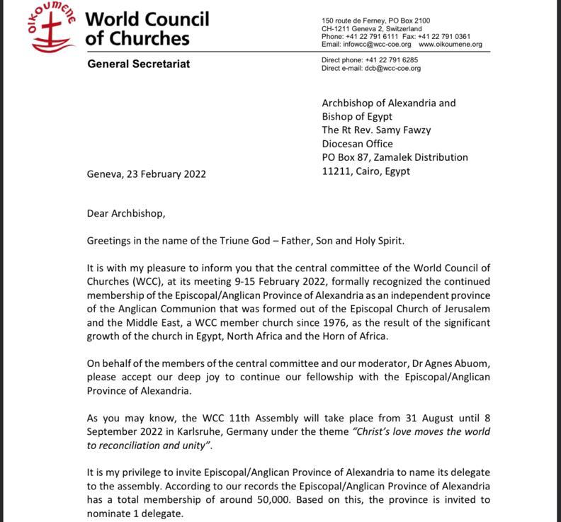 أعلن الدكتور سامي فوزي، رئيس أساقفة إقليم الإسكندرية للكنيسة الأسقفية الأنجليكانية، قبول عضوية الإقليم بمجلس الكنائس العالمي، إذ بعث المجلس خطاب تهنئة لرئيس الأساقفة يبلغه فيها بالقرار.