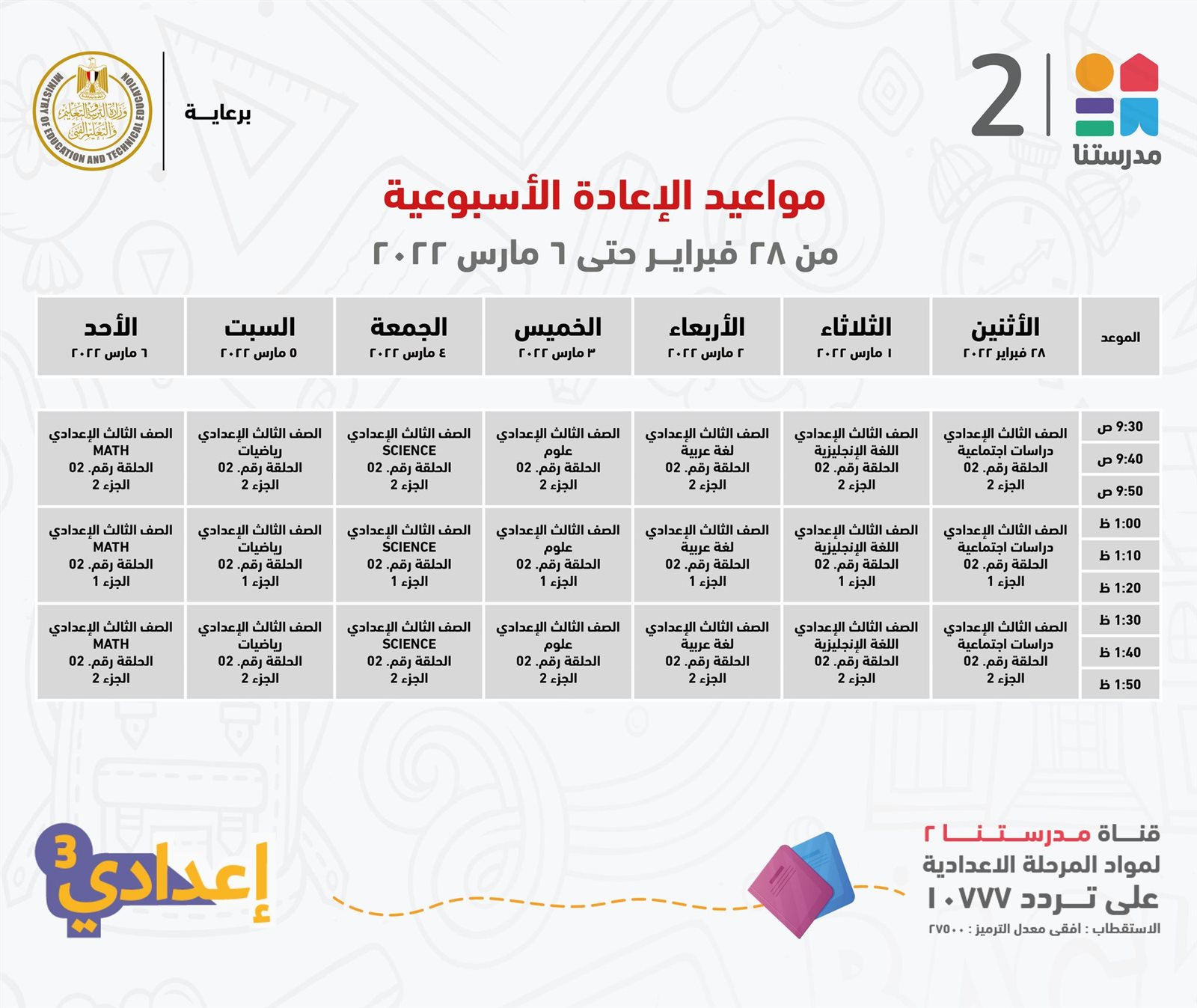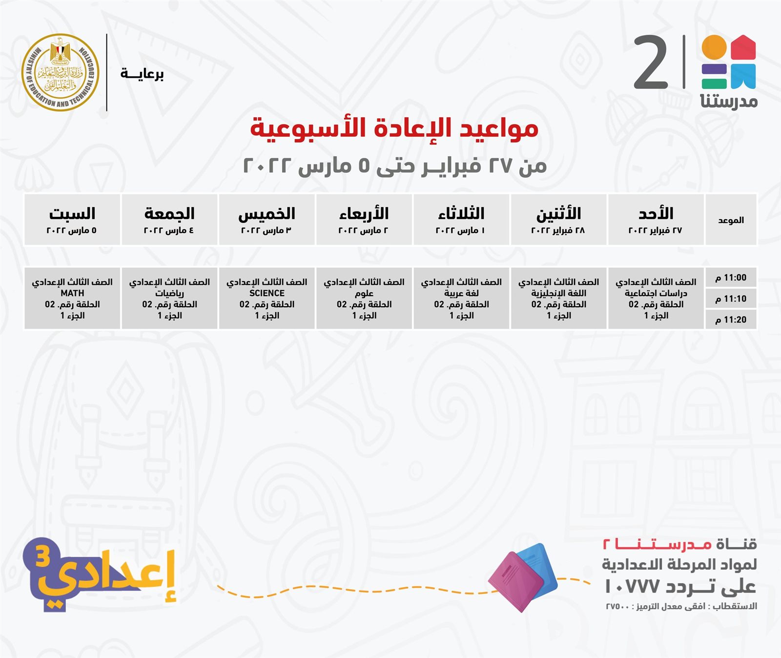 ونشرت القناة عبر صفحتها الرسمية على موقع التواصل الاجتماعي فيس بوك، قائلة: طلاب قناة "مدرستنا 2"، نقدم الجدول الخاص بـ "الصف الثالث الإعدادي" مع الإعادة، شاهدوه من خلال الصور، وتابعوا الدروس على التردد 10777 أفقي، حيث يمكنكم مشاهدة الجدول كاملًا من خلال اللينك التالي: