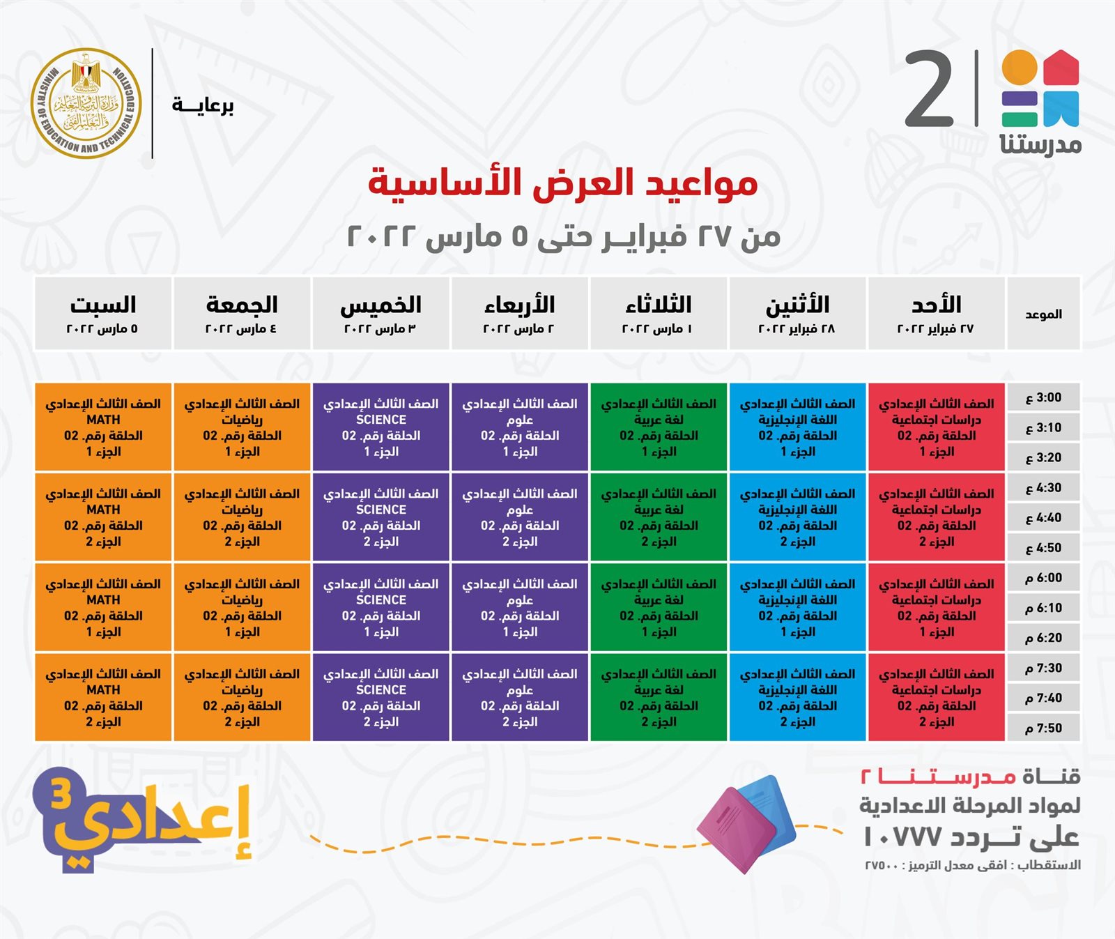أعلنت وزارة التربية والتعليم والتعليم الفني، عن جداول مواعيد عرض البرامج التعليمية، للمناهج الدراسية المقررة على لطلاب الصف الثالث الإعدادي، المقرر بثها على قناة مدرستنا 2 من الفترة 28 فبراير حتى 6 مارس.
