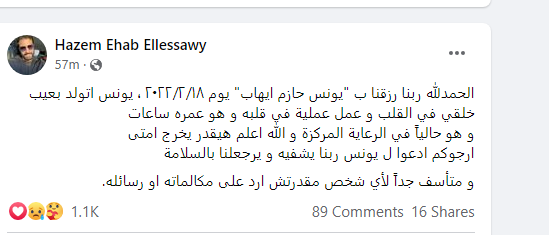 قال الفنان الشاب حازم إيهاب، إنه رزق مؤخرًا بطفل أسماه يونس، ولكن ولد بعيب خلقي جعله يخضع لعملية جراحية في القلب.