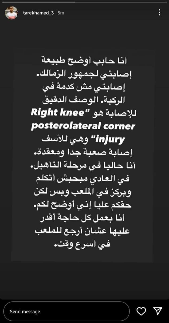 ونشر طارق حامد من خلال حسابه الشخصي، على موقع تبادل الصور انستجرام: أنا حابب أوضح طبيعة إصابتي لجمهور الزمالك، إصابتي مش كدمة في الركبة، الوصف الدقيق للإصابة هو Right knee posterolateral corner injury، وهي للأسف إصابة صعبة جدا ومعقدة.
