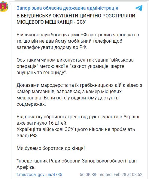 وأشارت وسائل الإعلام الأوكرانية إلى أن الجندي الروسي قرر قتل المواطن الأوكراني الأعزل لأنه رفض إعطاء الجندي الروسي هاتف محمول لإجراء اتصال هاتفي بزويه الموجودين بموسكو.