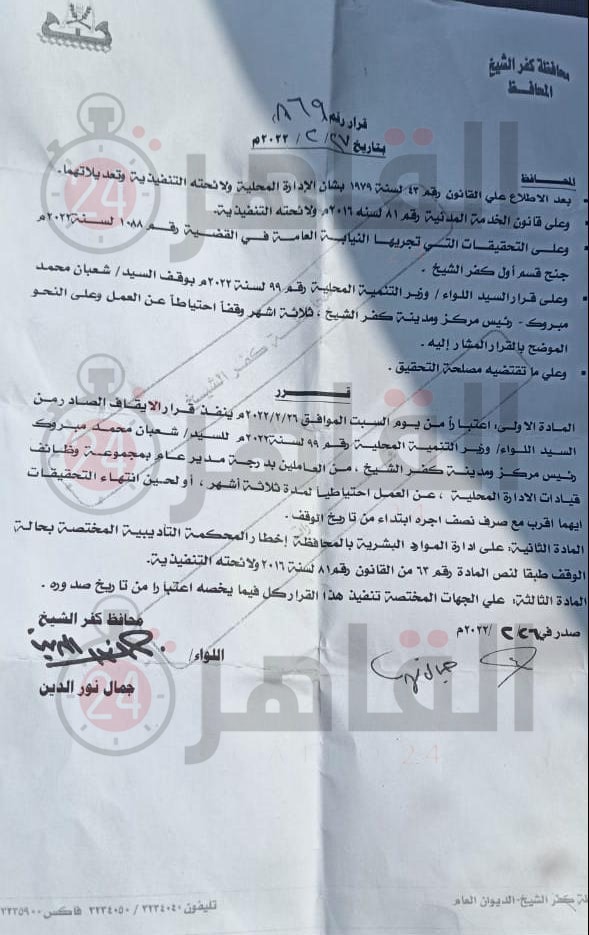 إيقاف رئيس مدينة كفر الشيخ 3 أشهر عن العمل | مستند