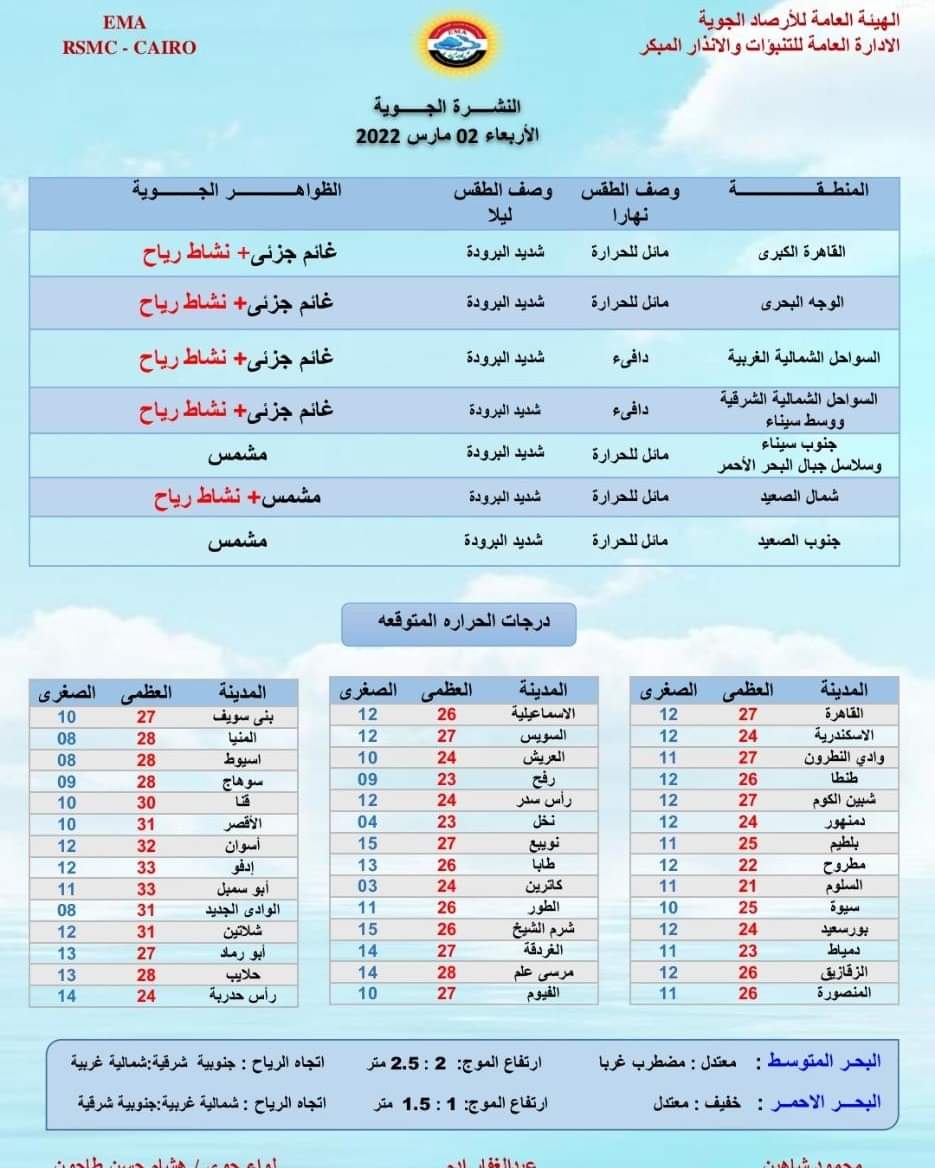 وأوضحت الهيئة سبب ارتفاع درجات الحرارة وحالة الطقس اليوم، والتي أشارت إلى هبوب رياح جنوبية قد تكون مثيرة للرمال والأتربة على شمال البلاد، كما يتوقع خبراء هيئة الأرصاد الجوية أن يبلغ ارتفاع درجات الحرارة في مصر ذروته اليوم الأربعاء.