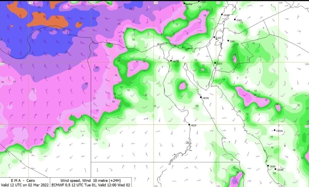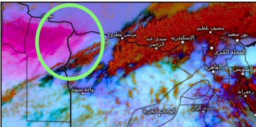 تشير أحدث صور للأقمار الصناعية التي ترصد حالة الطقس في مصر، إلى نشاط رياح مثيرة للرمال على أقصى غرب البلاد، والتي يرمو إليها باللون الوردي على الخريطة التالية، قد تصل إلى حد العاصفة على مناطق من غرب البلاد.