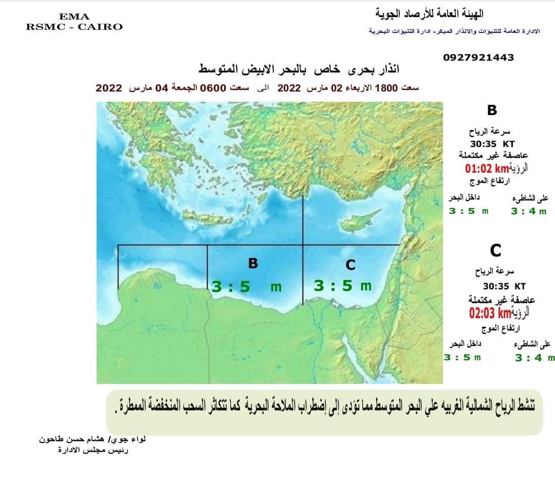 وأصدرت هيئة الأرصاد الجوية تحذيرًا السواحل الشمالية والمدن المطلة على البحر المتوسط، نظرا لاحتمالية تعرض البحر المتوسط لنشاط رياح قوية تصل سرعتها إلى 70 كم / الساعة، وتتسبب في ارتفاع الأمواج بقيم تتراوح ما بين 3 إلى 5 أمتار فوق سطح البحر، وسقوط أمطار.