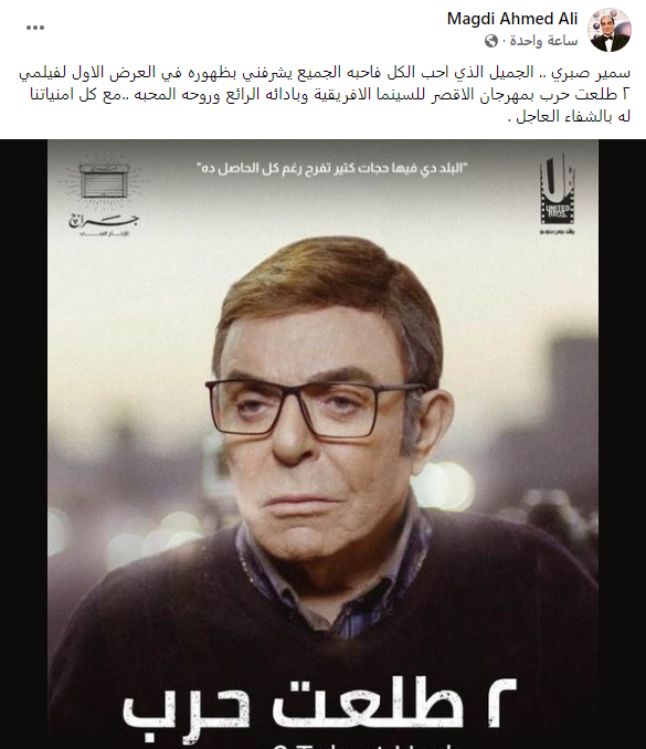 ونشر المخرج مجدي أحمد علي، صورة لبوستر فيلمه: 2 طلعت حرب، عبر حسابه الشخصي بموقع التواصل الاجتماعي فيس بوك، وعلق: سمير صبري.. الجميل الذي أحب الكل فأحبه الجميع، يشرفني بظهوره في العرض الأول لفيلمي 2 طلعت حرب بمهرجان الأقصر للسينما الأفريقية، وبأدائه الرائع وروحه المحبة، مع كل امنياتنا له بالشفاء العاجل.