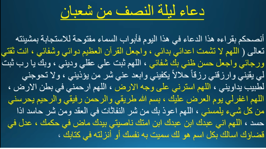 - فَإِنَّكَ قُلْتَ وَقَوْلُكَ الْحَقُّ فِي كِتَابِكَ الْمُنَزَّلِ عَلَى لِسَانِ نَبِيِّكَ الْمُرْسَلِ: ﴿يَمْحُو اللهُ مَا يَشَاءُ وَيُثْبِتُ وَعِنْدَهُ أُمُّ الْكِتَابِ﴾، إِلَهِي بِالتَّجَلِّي الْأَعْظَمِ فِي لَيْلَةِ النِّصْفِ مِنْ شَهْرِ شَعْبَانَ الْمُكَرَّمِ، الَّتِي يُفْرَقُ فِيهَا كُلُّ أَمْرٍ حَكِيمٍ وَيُبْرَمُ، أَنْ تَكْشِفَ عَنَّا مِنَ الْبَلَاءِ مَا نَعْلَمُ وَمَا لَا نَعْلَمُ وَمَا أَنْتَ بِهِ أَعْلَمُ، إِنَّكَ أَنْتَ الْأَعَزُّ الْأَكْرَمُ، وَصَلَّى اللهُ عَلَى سَيِّدِنَا مُحَمَّدٍ النَّبِيِّ الأُمِّيِّ وَعَلَى آلِهِ وَصَحْبِهِ وَسَلَّمَ".