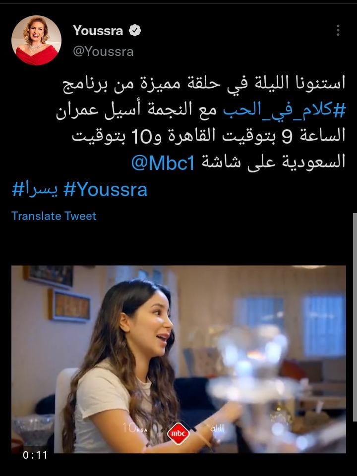 ونشرت يسرا، برومو حلقة أسيل عمران، عبر حسابها الرسمي بموقع التدوينات القصيرة تويتر، وكتبت معلقة على الفيديو: استنونا في حلقة مميزة من برنامج كلام في الحب، مع النجمة أسيل عمران، الساعة 9 بتوقيت القاهرة، و10 بتوقيت السعودية، على شاشة إم بي سي.