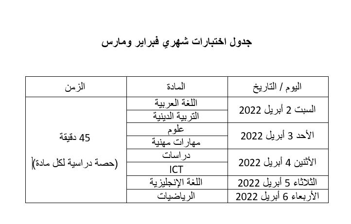 وبالنسبة لاختبار نهاية الفصل الدراسي الثاني، تعقد الاختبارات في الفترة من 8 إلى 12 مايو 2022، وتقتصر الأسئلة على خطة توزيع المنهج المقرر للفصل الدراسي الثاني.