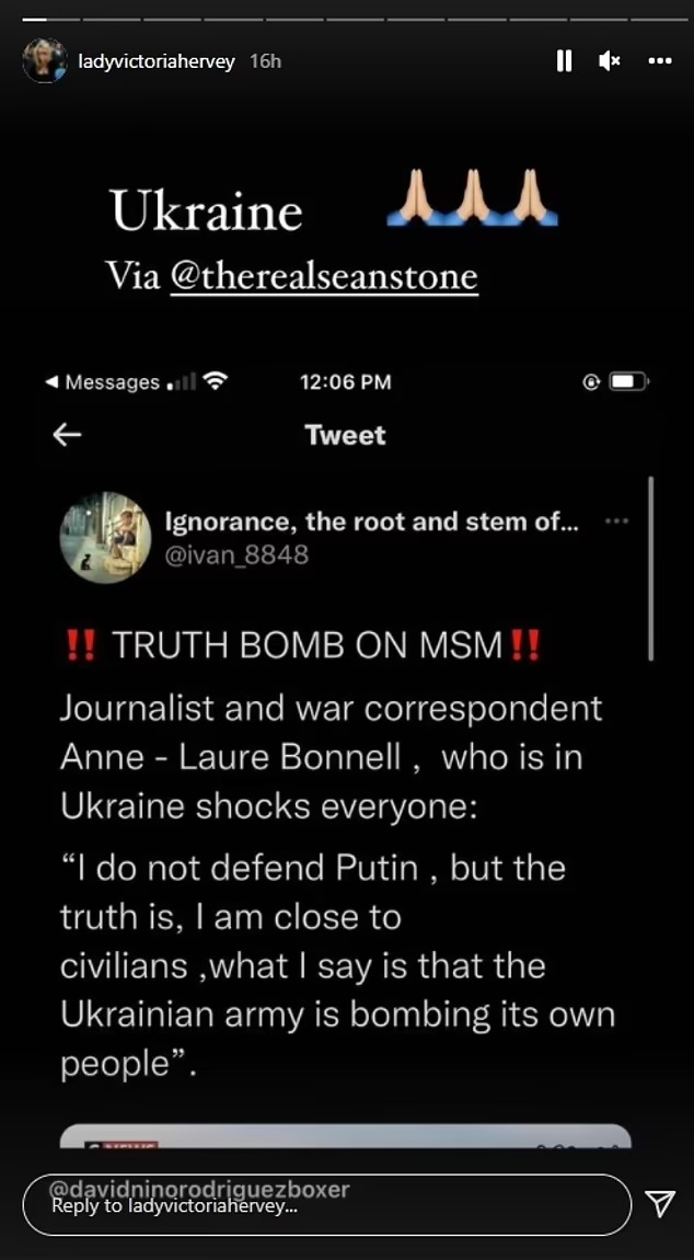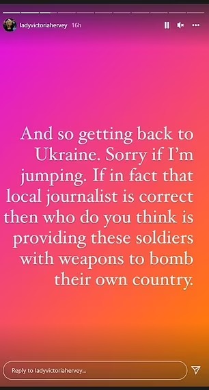 وشاركت فيكتوريا هيرفي، ناشطة اجتماعية وعارضة أزياء إنجليزية، عددًا من المنشورات على انستجرام تتحدث عن مزاعم نظرية المؤامرة والحرب في أوكرانيا معلقة: أوكرانيا من تقصف نفسها.