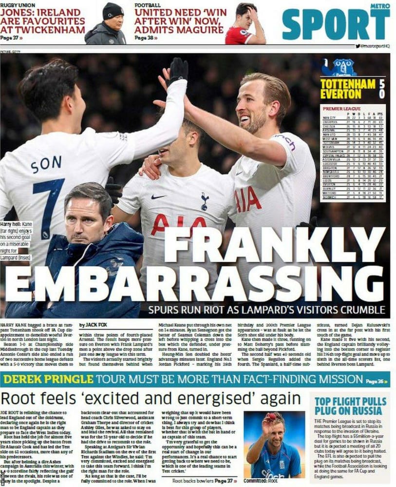 عنونت مترو في غلافها اليوم بـ توتنهام يسقط فريق لامبارد بخماسية.