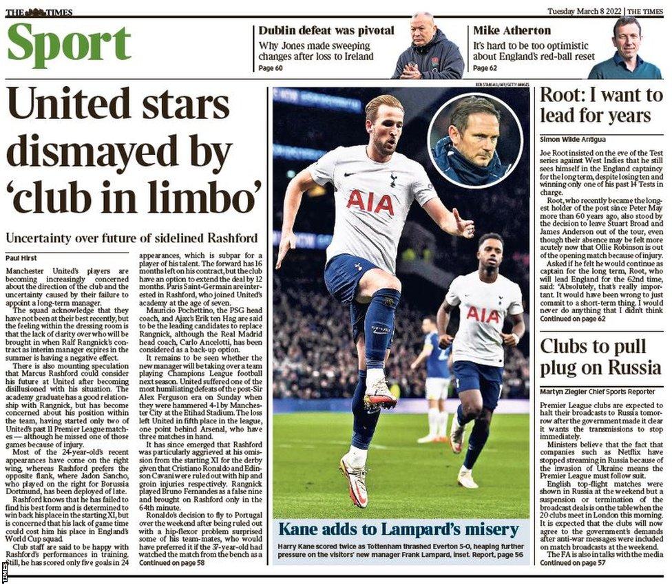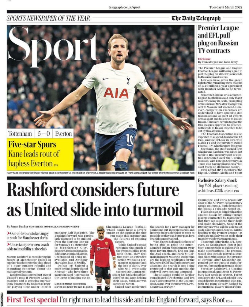 أشارت صحيفة تيليجراف في غلافها إلى غموض مستقبل ماركوس راشفورد مع مانشستر يونايتد، حيث قالت: راشفورد يرى مستقبله مع مانشستر يونايتد في حالة غموض.