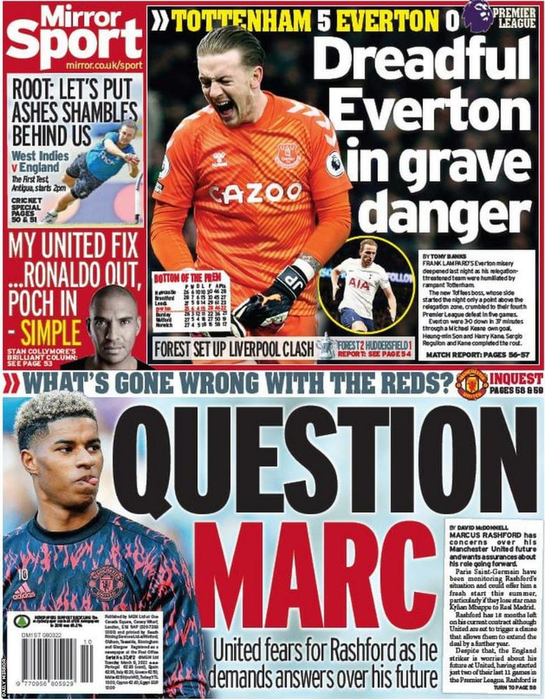 تصدر العنوان، تساؤل راشفورد، غلاف صحيفة ميرور الإنجليزية اليوم، وذلك بعد أن أفادت الصحيفة بأن هناك قلقًا في مانشستر يونايتد مع عدم وضوح راشفورد أو رده بشأن مستقبله رفقة النادي في الفترة القادمة.