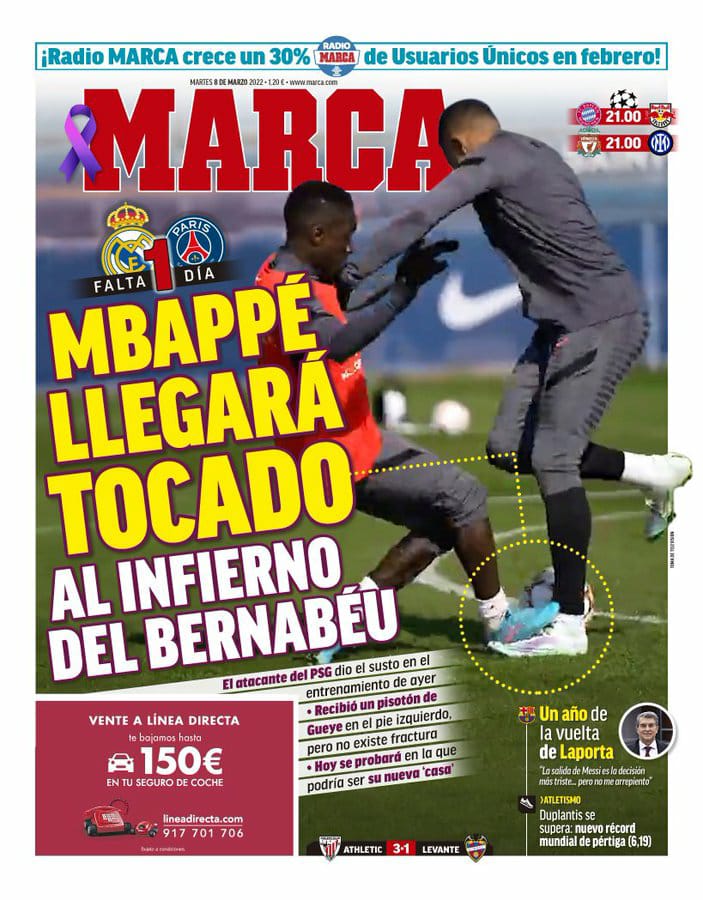 عنونت ماركا في غلافها بـ مبابي سيصل متأثرًا إلى جحيم البرنابيو، وذلك بعد أن تلقى ضربة في قدمه خلال التدريبات قبل مواجهة ريال مدريد.