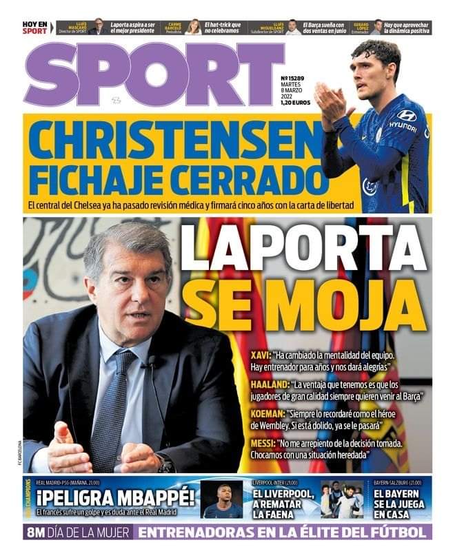 تصدر العنوان، برشلونة ينهي اتفاقه مع كريستينسين، غلاف الصحيفة، حيث اجتاز قلب دفاع تشيلسي بالفعل المراجعة الطبية وسيوقع لخمس سنوات قادمة.