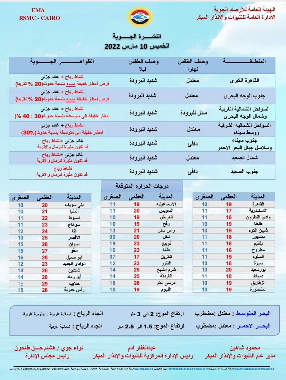 وأشارت الهيئة إلى أن طقس اليوم مائل للبرودة على السواحل الشمالية الغربية وشمال الوجه البحري، مع وجود طقس دافئ على جنوب سيناء وسلاسل جبال البحر الأحمر، جنوب الصعيد نهارًا.