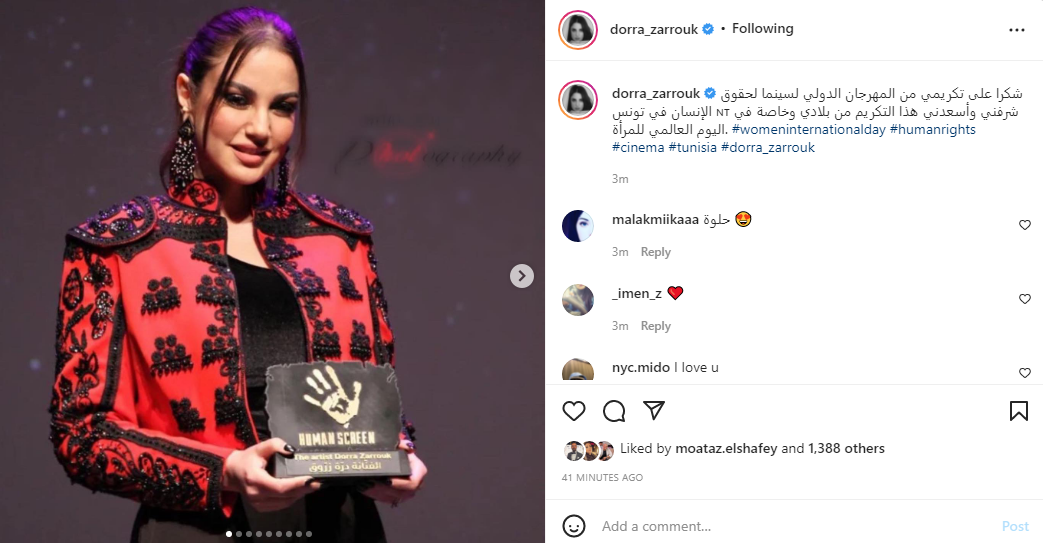 ونشرت درة، مجموعة من الصور عبر حسابها الشخصي بموقع تبادل الصور والفيديوهات القصيرة انستجرام، وعلقت قائلة: شكرًا على تكريمي من المهرجان الدولي للسينما لحقوق الإنسان في تونس شرفني وأسعدني هذا التكريم من بلادي وخاصة في اليوم العالمي للمرأة.