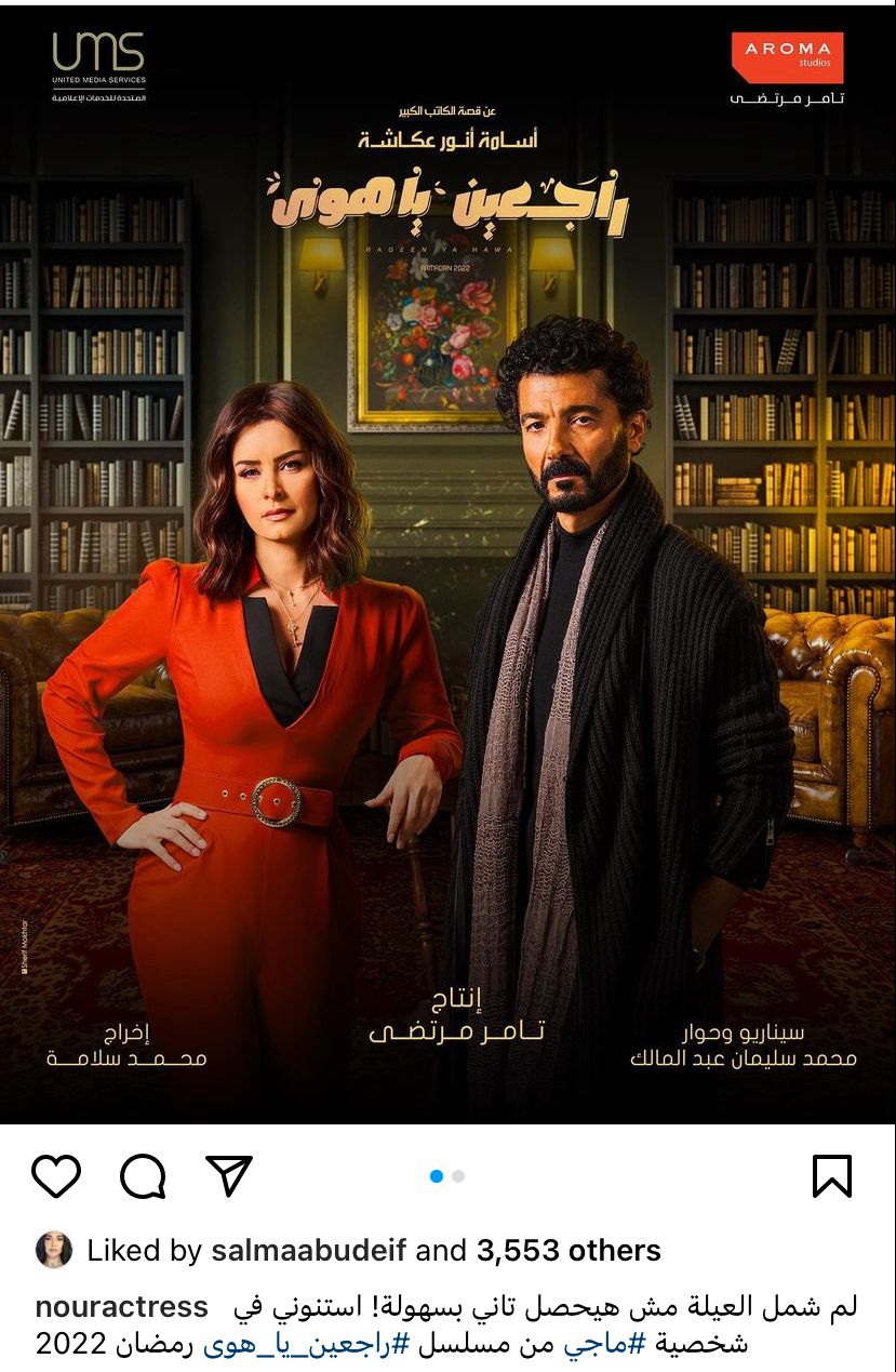 كشفت الفنانة نور اللبنانية عن شخصياتها في مسلسل راجعين ياهوى، حيث وشاركت متابعيها عبر موقع تبادل الصور والفيديوهات القصيرة انستجرام، بوستر المسلسل معلقه لم شمل العيلة مش هيحصل تاني بسهولة! استنوني في شخصية “ماجي” من مسلسل “راجعين ياهوى ” في رمضان 2022 .