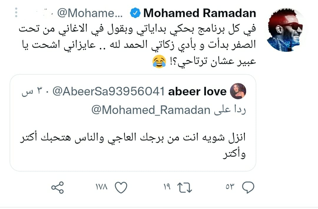 وجاءت رسالة إحدى المتابعات لـ محمد رمضان، عبر موقع التدوينات القصيرة تويتر، كالتالي: أنزل شوية أنت من برجك العالي، والناس هتحبك أكتر وأكتر.
