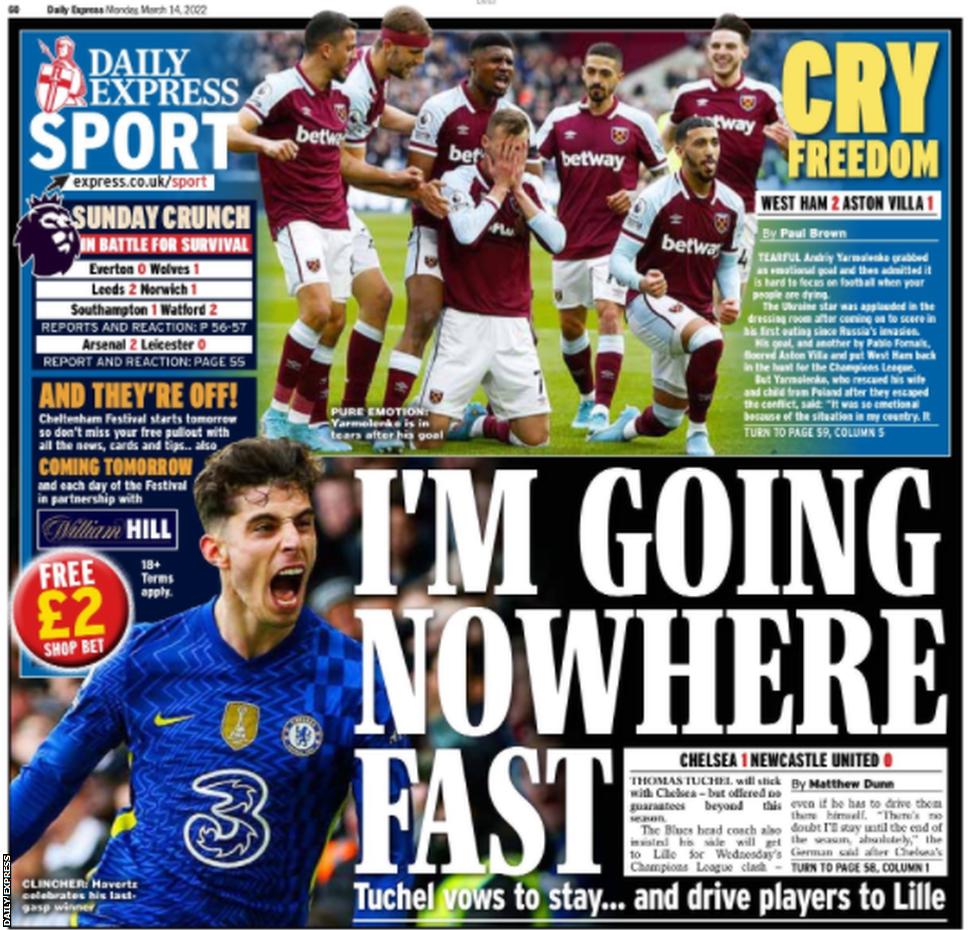 سلطت ديلي إكسبريس في غلافها الضوء على حماس توخيل مدرب البلوز، وذلك بعد تصريحه "أنا سأذهب إلى أي مكان بسرعة" عقب سؤاله عن موقف فريق تشيلسي من مباراة ليل وأجاب أنه سيذهب بالسيارة إذا لم يجد طائرة.