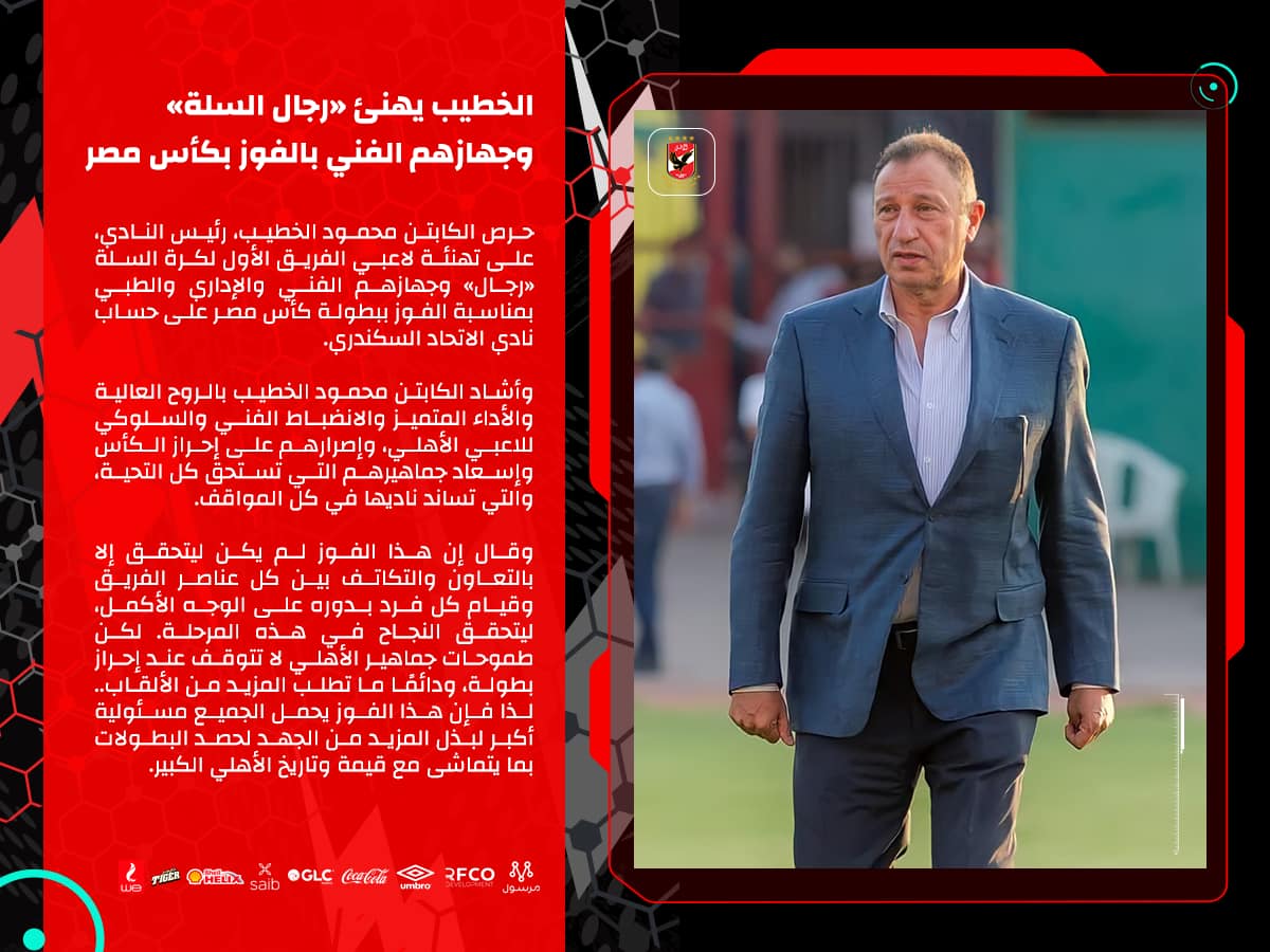 وأشاد الكابتن محمود الخطيب بالروح العالية والأداء المتميز والانضباط الفني والسلوكي للاعبي الأهلي، وإصرارهم على إحراز الكأس وإسعاد جماهيرهم التي تستحق كل التحية والتي تساند ناديها في كل المواقف.