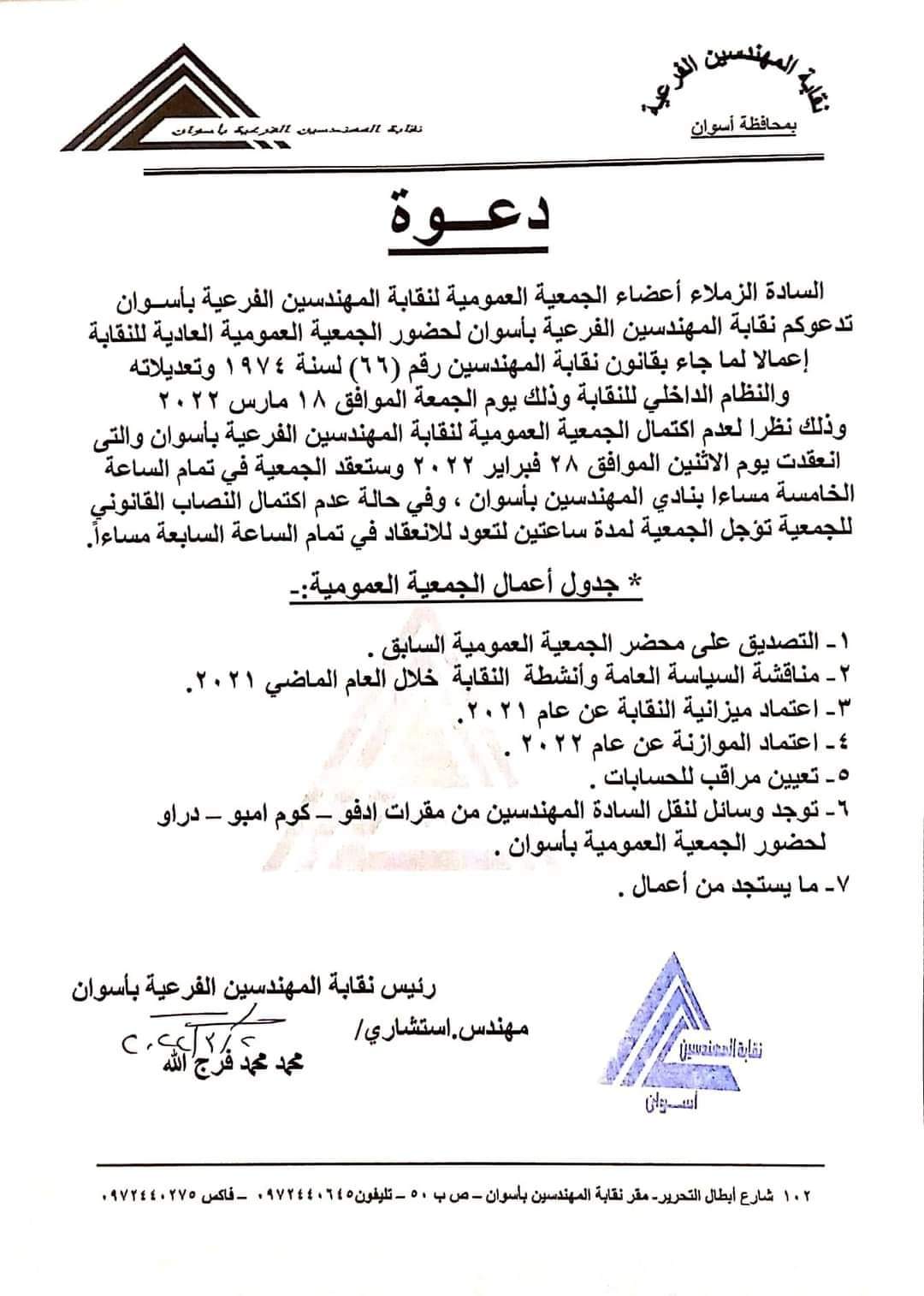 أعلنت نقابة المهندسين الفرعية بأسوان، عقد اجتماع الجمعية العمومية للنقابة، يوم الجمعة 18 مارس الجاري.