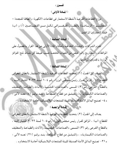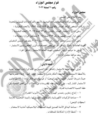 ونصت المادة الأولى على أنه: تتولى الهيئة العامة للاستثمار والمناطق الحرة التنسيق، مع كافة الوزارات والجهات المعنية بالأنشطة الاستثمارية لأحكام قانون الاستثمار المشار إليه، لإبداء مقترحاها حبال شروط اعتبار الشرائجيا أو قوميا وفق حكم المادة 20، من قانون الاستثمار المشار إليه، على أن تكون المشروعات في المجالات التي تحقق التنمية وفق خطة التنمية الاقتصادية للدولة: