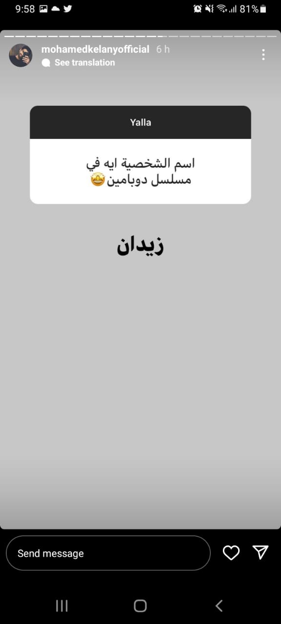 ورد محمد كيلاني على سؤال أحد متابعيه، حول اسم شخصيته في مسلسل دوبامين، عبر خاصية ستوري بموقع تبادل الصور والفيديوهات انستجرام، وقال: زيدان.