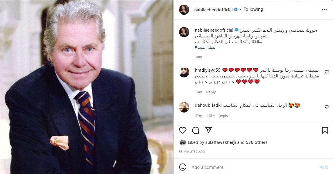 ونشرت نبيلة عبيد، صورة حسين فهمي، عبر حسابها بموقع إنستجرام، وعلقت عليها: مبروك لصديقي وزميلي، النجم الكبير حسين فهمي، رئاسة مهرجان القاهرة السينمائي، الفنان المناسب في المكان المناسب.